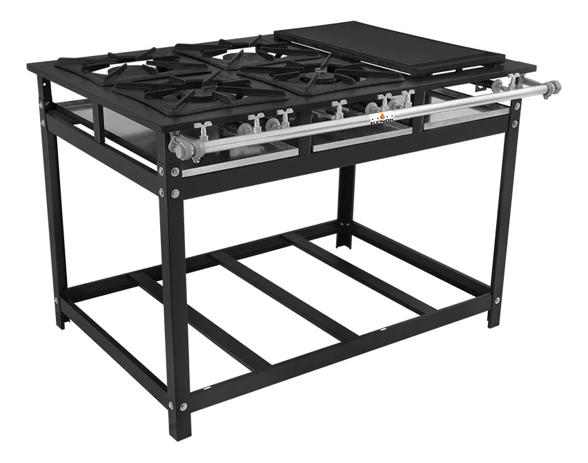 Cuenta con 4 hornallas a gas, combinando quemadores simples y dobles, lo que permite trabajar diferentes tipos de preparaciones en simultáneo. Incorpora bifera integrada, ideal para carnes, hamburguesas y alimentos a la plancha, optimizando espacio y tiempos de cocción.