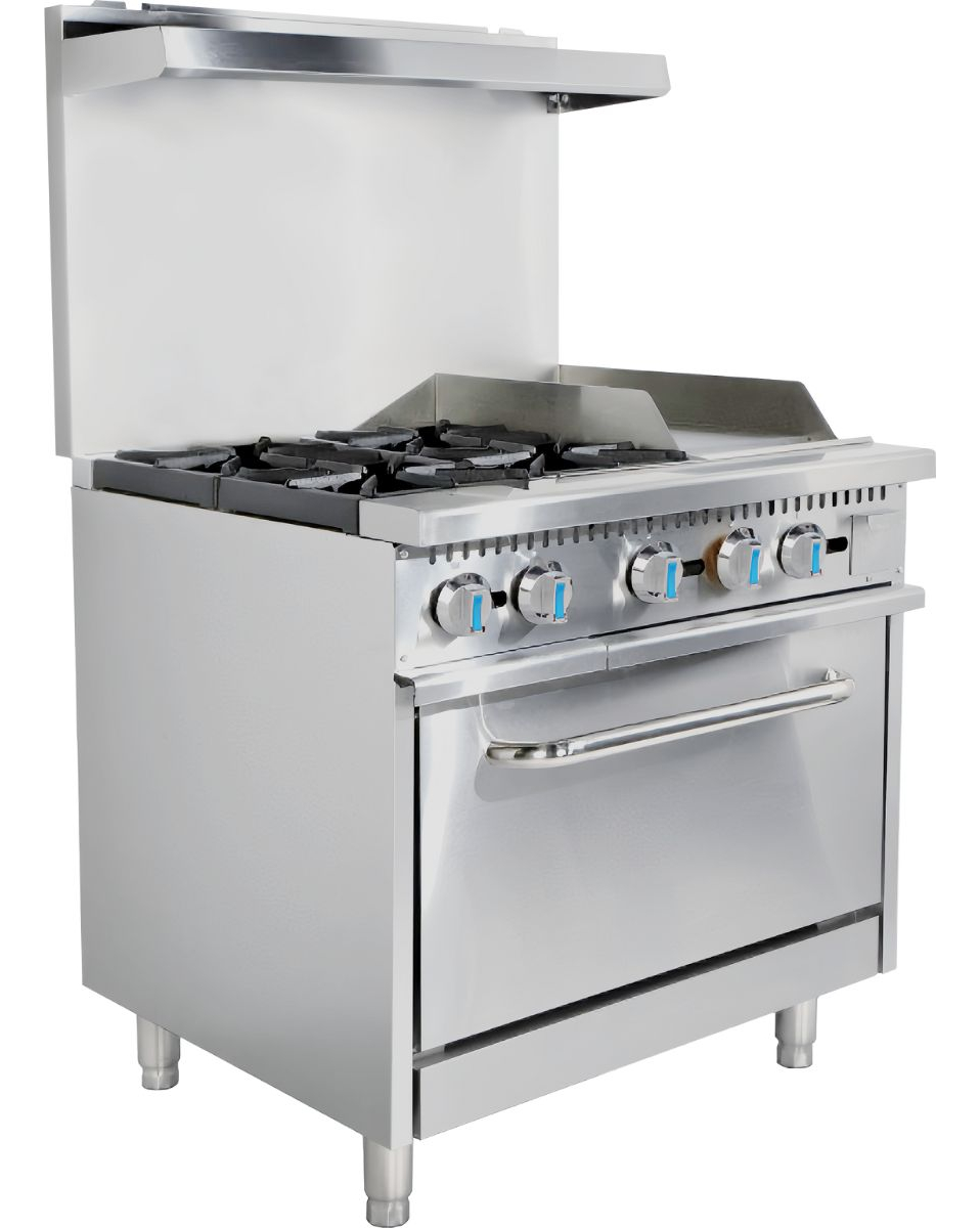 Cocina de estilo americano Heston modelo HSD-B36-G12, diseñada para uso profesional en gastronomía. Combina cuatro hornallas de alta potencia con una plancha de 12″, ideal para cocinas comerciales que requieren versatilidad y gran rendimiento.