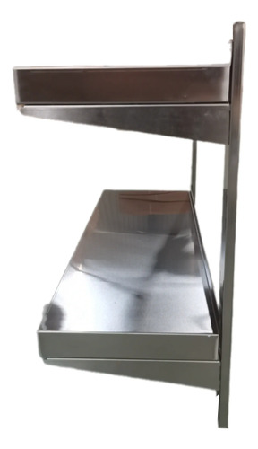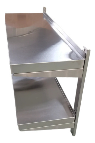 Su diseño de doble nivel permite maximizar el almacenamiento en altura, ofreciendo mayor capacidad para organizar utensilios, insumos o pequeños equipos. La estructura es sólida y funcional, pensada para un uso intensivo y continuo.