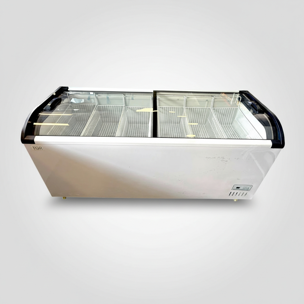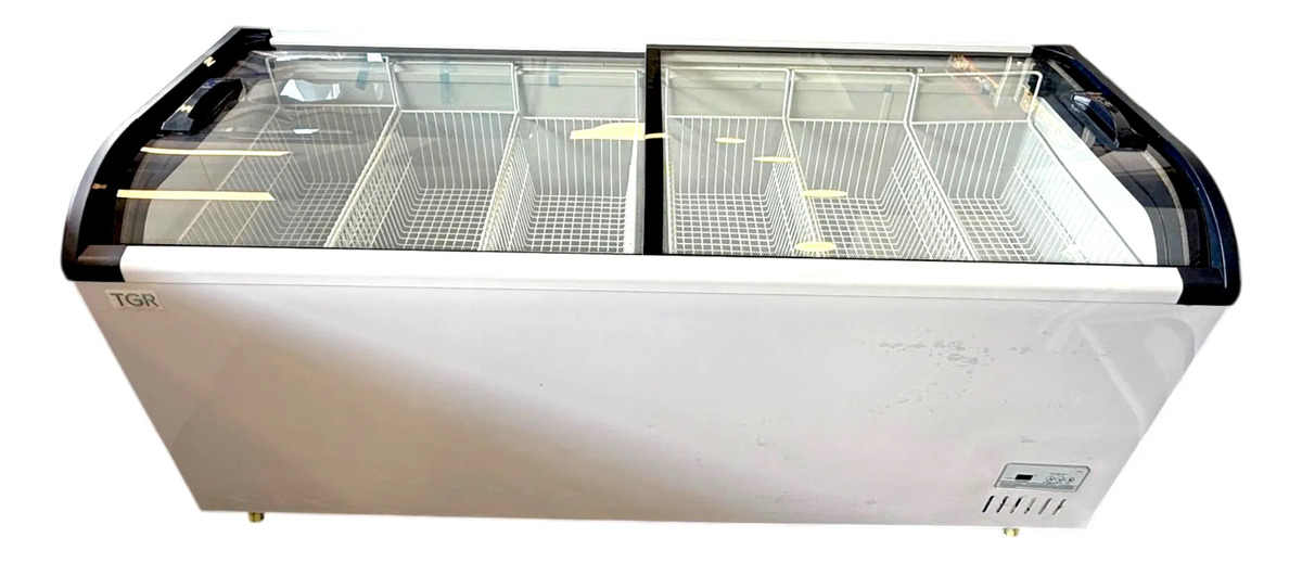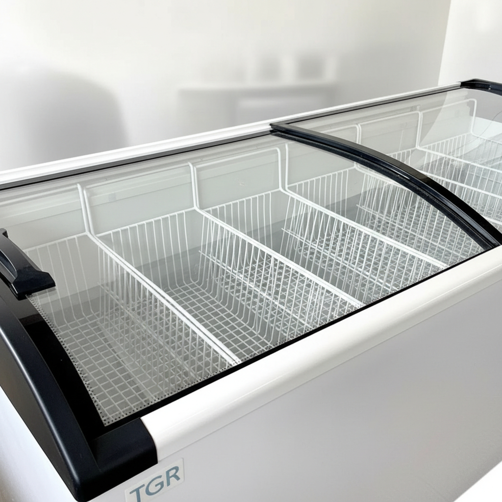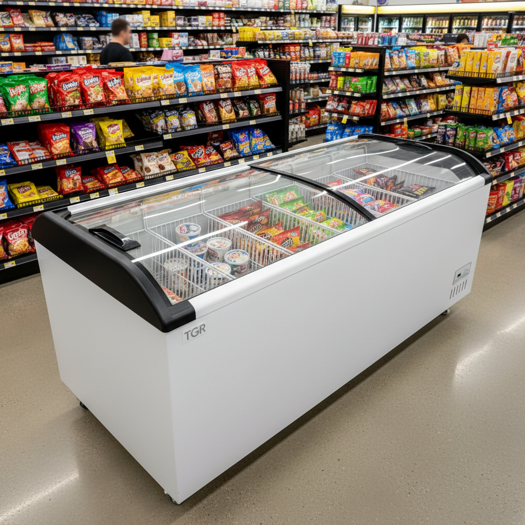 Freezer horizontal TGR con tapa curva de vidrio, diseñado para la exhibición y conservación de productos congelados en supermercados, autoservicios, minimercados y comercios gastronómicos.