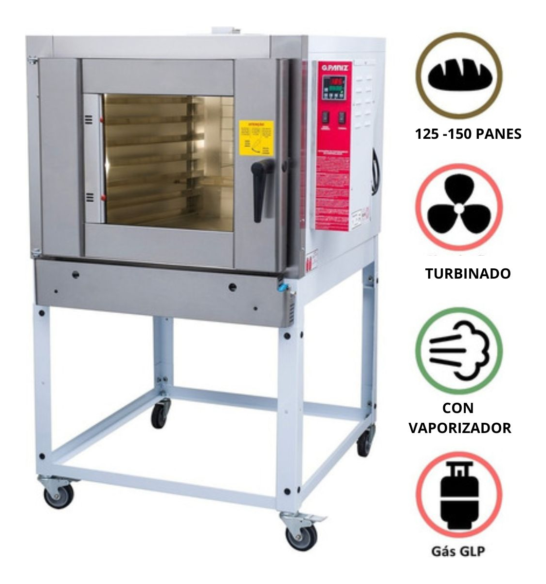 Horno turbo a gas FTG150 de G.Paniz, diseñado para panaderías, pastelerías y negocios de producción que buscan un horneado uniforme y eficiente. Fabricado en acero SAE 1020 con acabado resistente a altas temperaturas, incorpora una cámara interna de gran volumen con guías de acero inoxidable para 5 charolas (40×60 cm, 45×65 cm o 60×80 cm). Cuenta con aislamiento térmico de 75 mm para evitar pérdidas de calor y sistema turbo con turbina que recircula el aire para asegurar cocción pareja. Además incluye vaporizador en abanico con tiempo ajustable, controles digitales con 10 memorias para temperatura, vapor y tiempos, puerta con ventana sin remaches y empaques sellados para evitar fugas. Las resistencias son deslizables para facilitar mantenimiento.