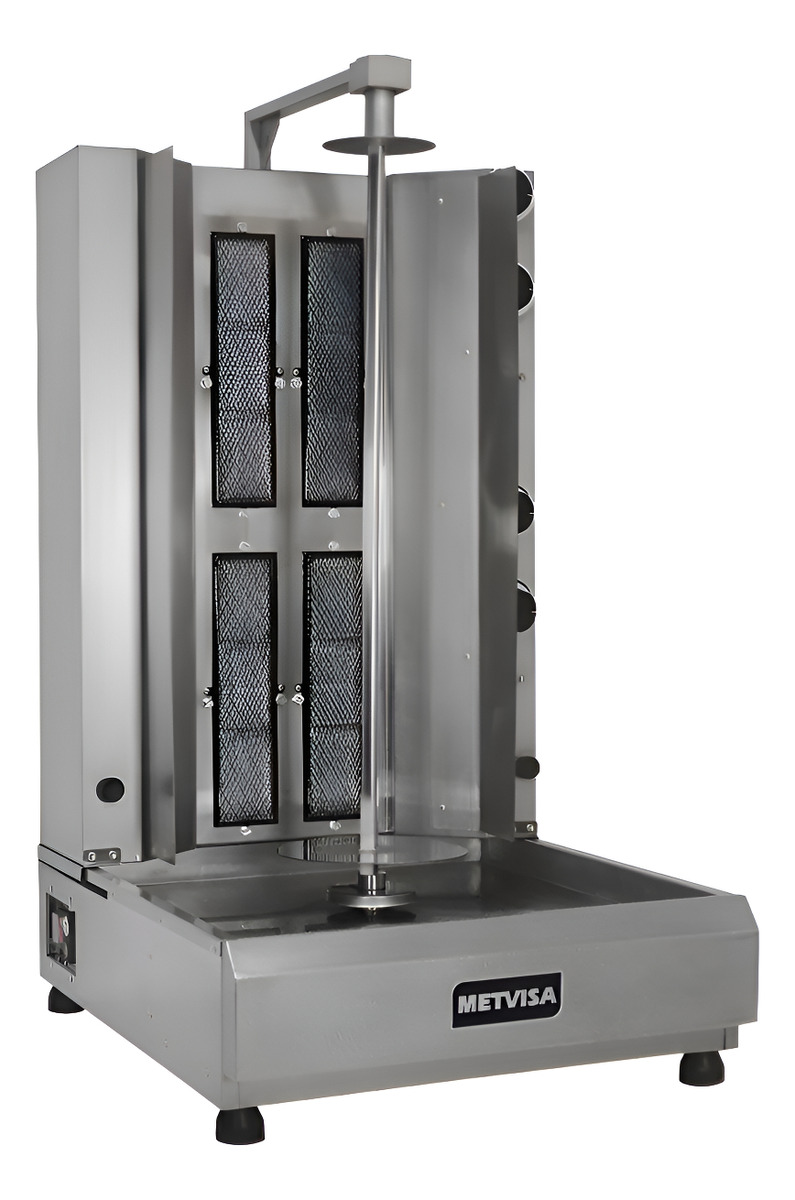 -Asador de acero inoxidable ideal para asar hasta 20 kg de carne en piezas enteras o en capas. Posee pincho giratorio eléctrico, colector de grasas, espátula de acero y 4 quemadores infrarrojos.