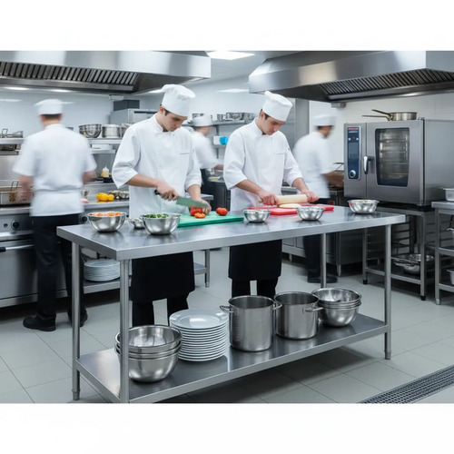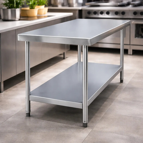 Optimice su espacio de trabajo con esta mesada de acero inoxidable reforzada, ideal para uso profesional en cocinas industriales, comercios gastronómicos o también para el hogar.