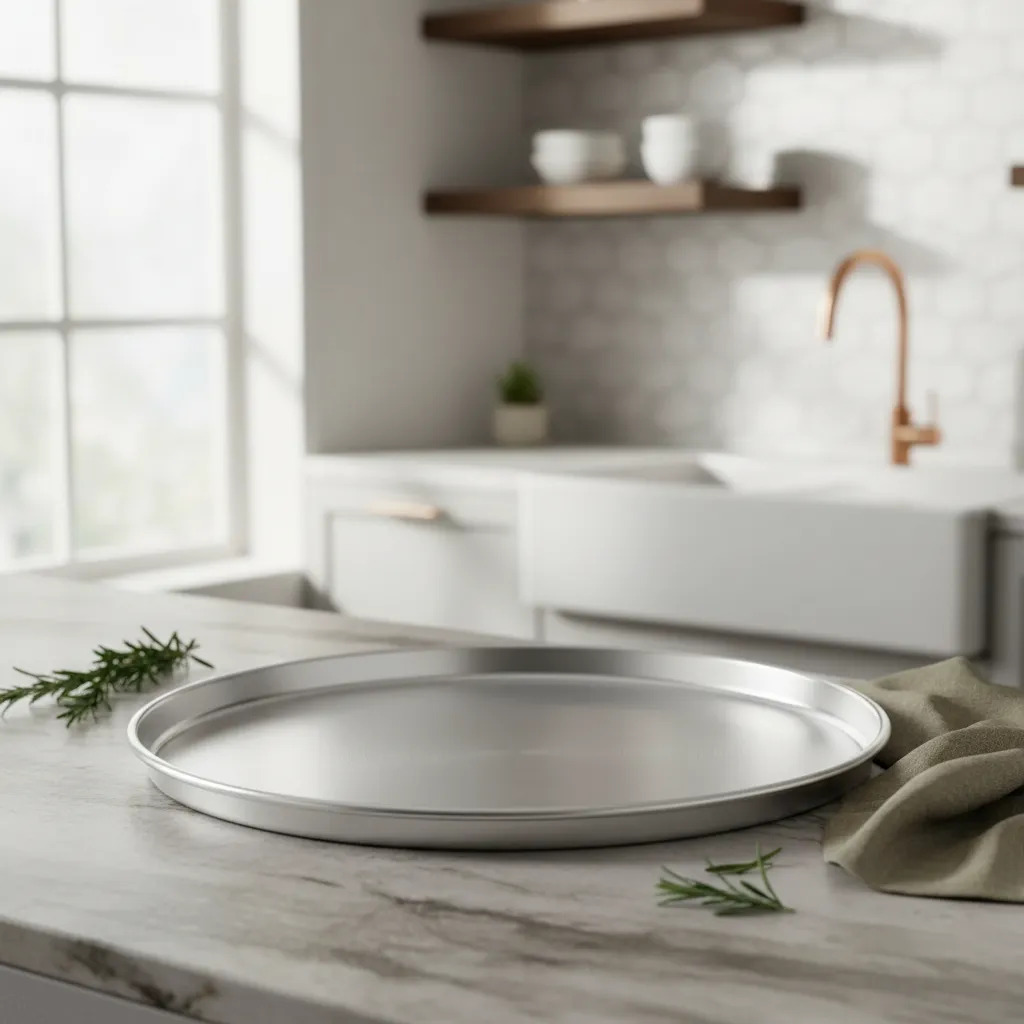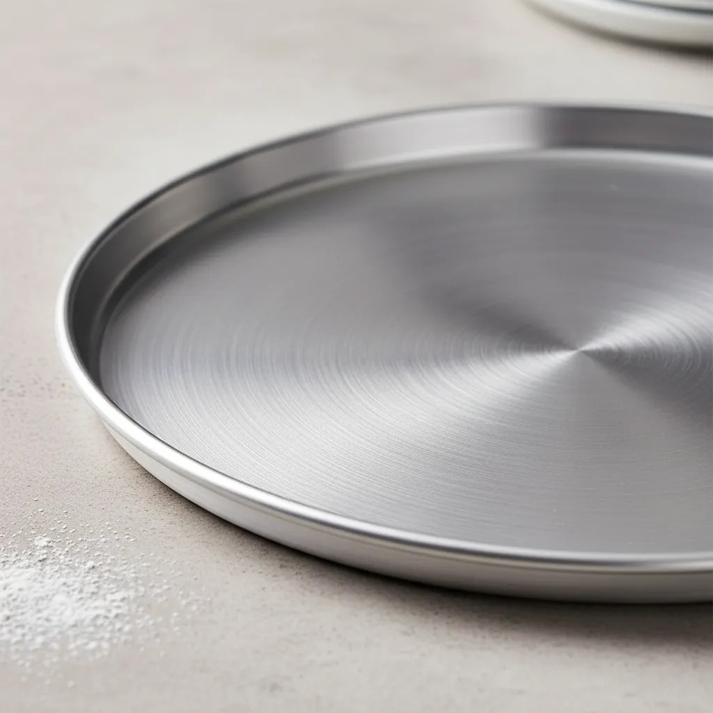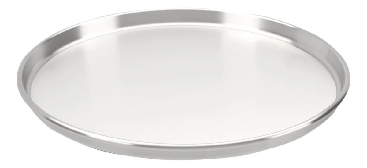 Molde para pizza con acabado pulido, ideal para preparar recetas caseras de forma práctica.