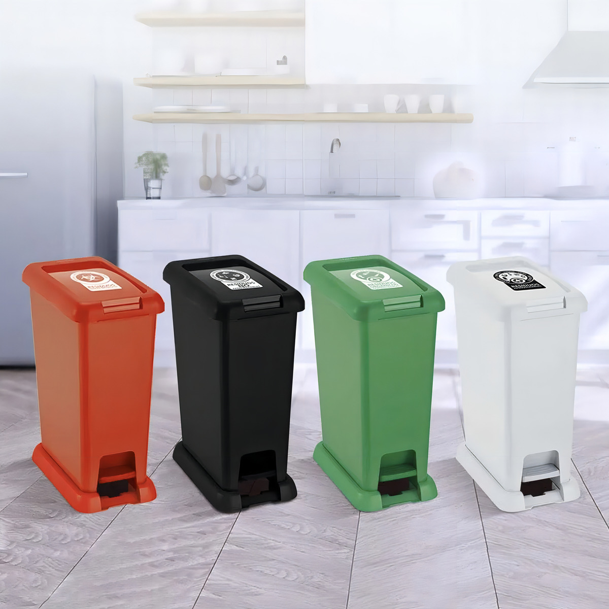 Sistema de apertura: Tapa abatible accionada por pedal, que permite una apertura y cierre suaves, evitando el contacto directo con los residuos.