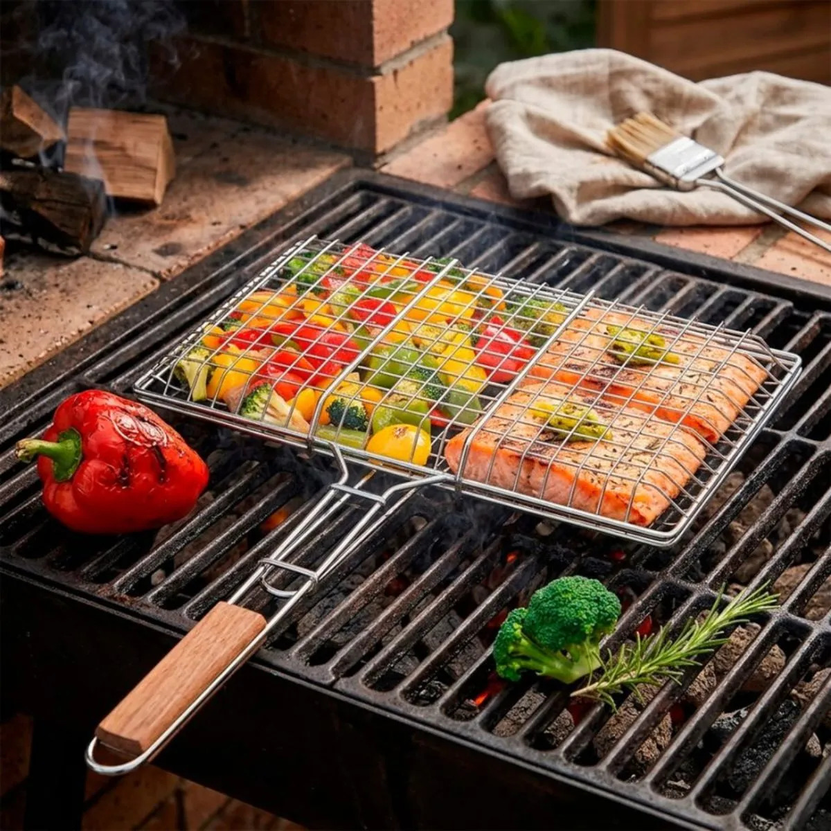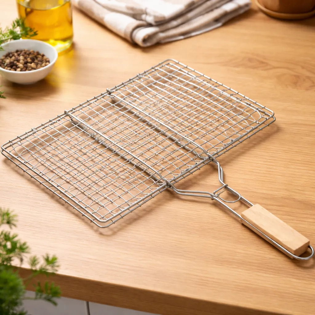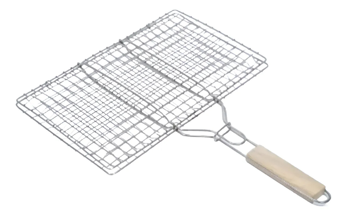 Pinza Doble Grill Parrillero Barbacoa 40×22 Cm Asa De Madera