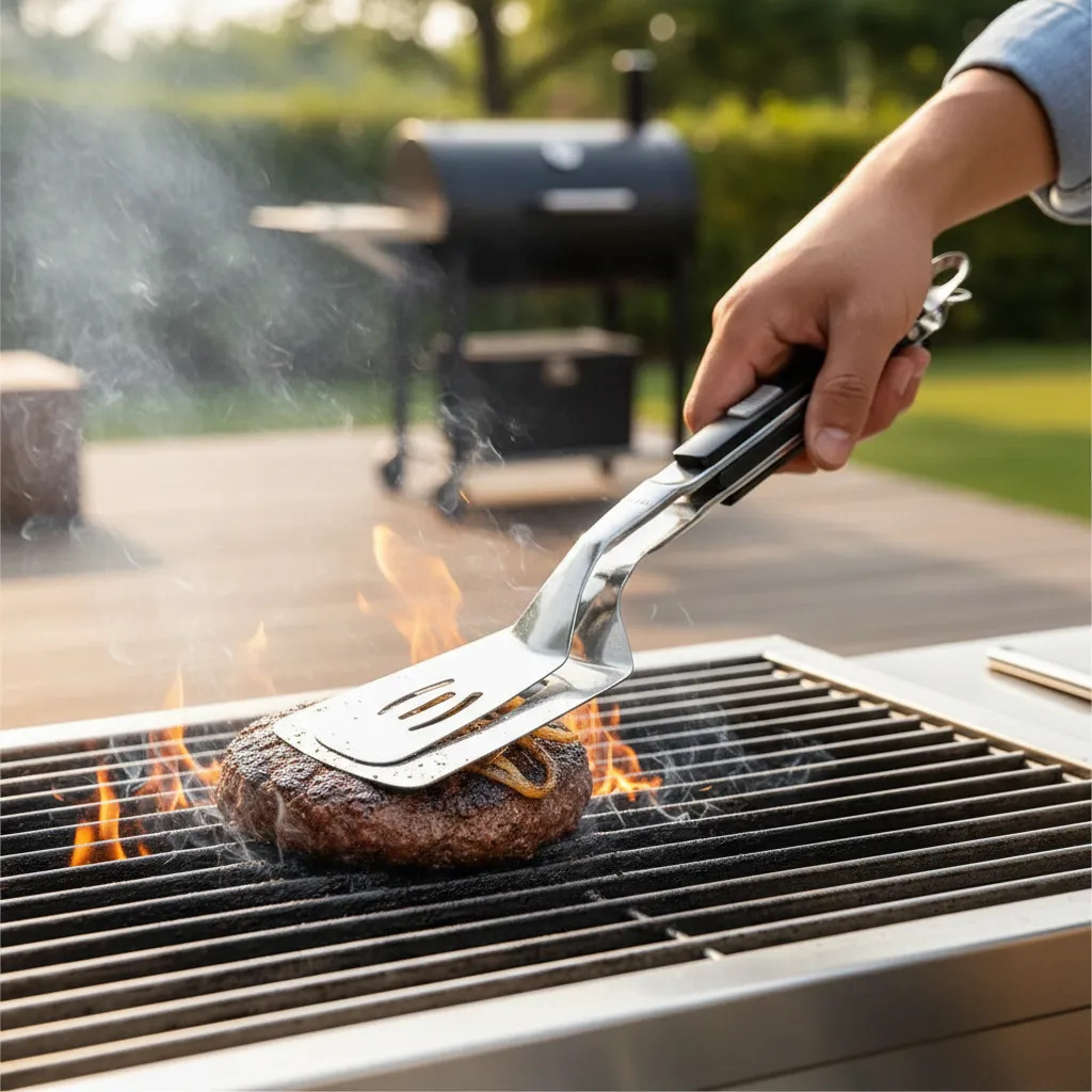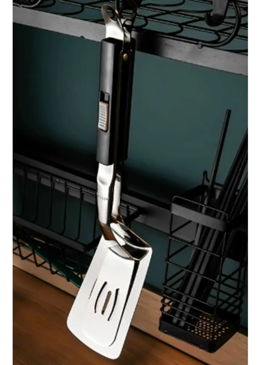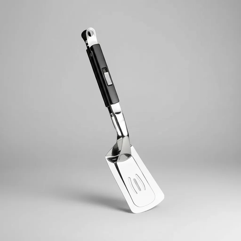 Su diseño combina pinza y espátula, permitiendo manipular alimentos con mayor comodidad y precisión.