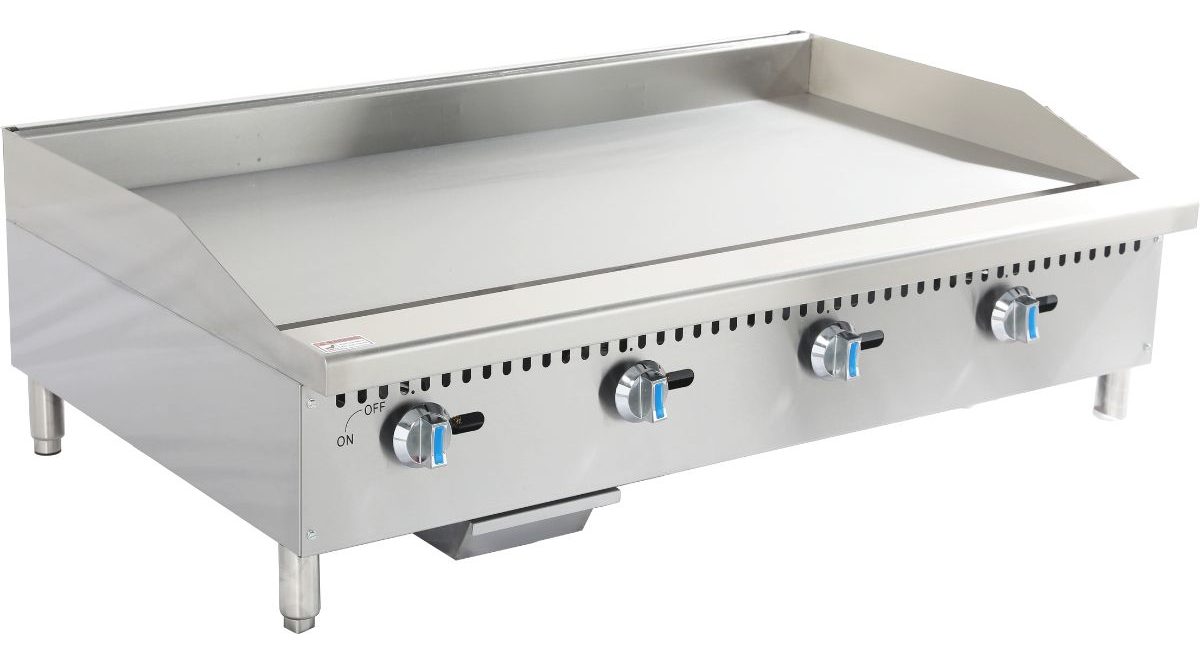 Está equipada con una placa de cocción de 3/4″ de espesor, que asegura excelente retención de calor y una distribución térmica uniforme. Sus quemadores en forma de U cubren toda la superficie de cocción, ofreciendo un rendimiento estable incluso durante jornadas intensivas.