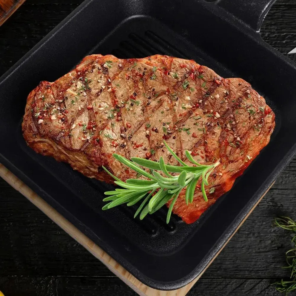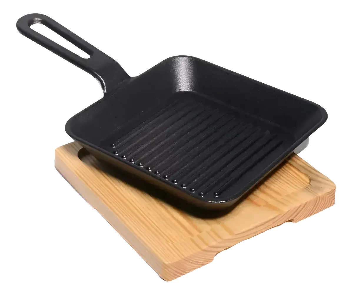 Llevá el sabor de la parrilla a otro nivel. Nuestra plancha bifera de hierro fundido con superficie grillada es ideal para lograr un sellado perfecto y las clásicas marcas que realzan la presentación y el sabor. Incluye una tabla de madera, ideal para servir directamente a la mesa.