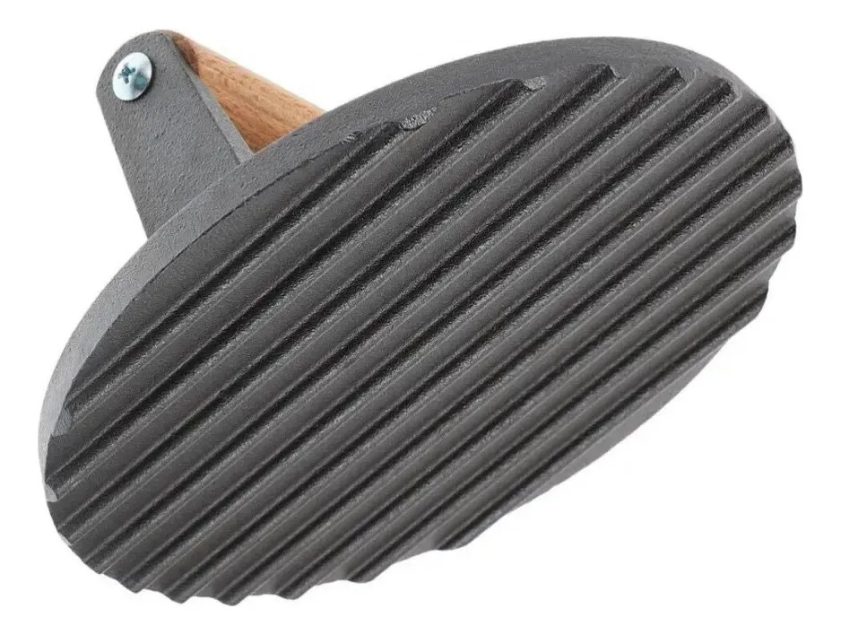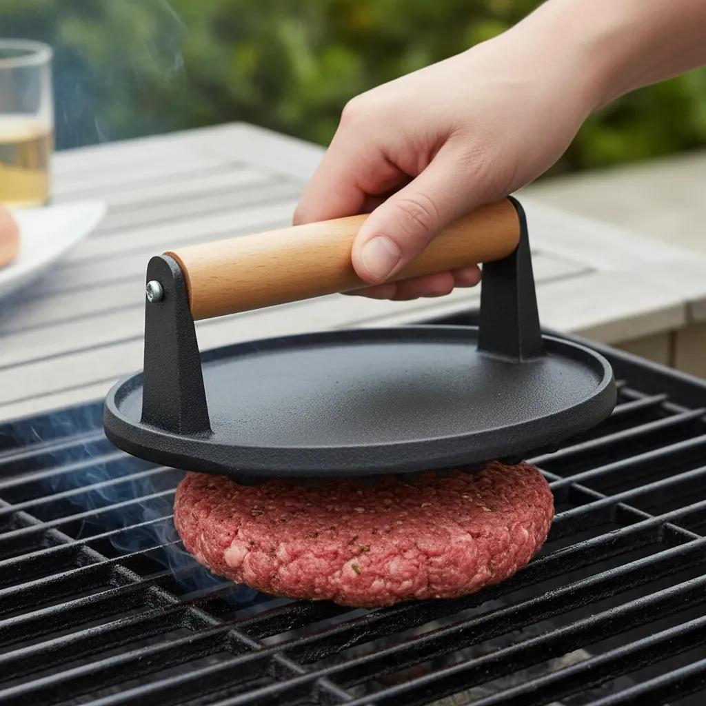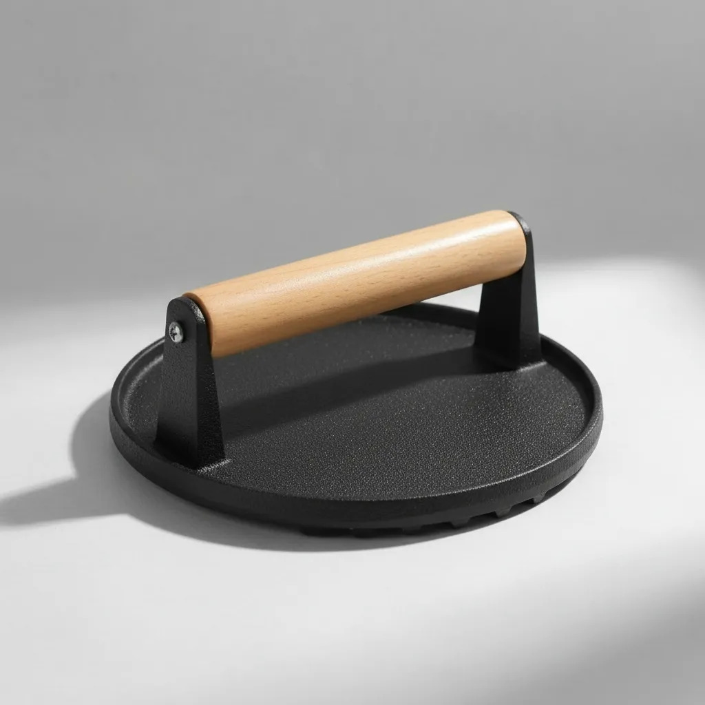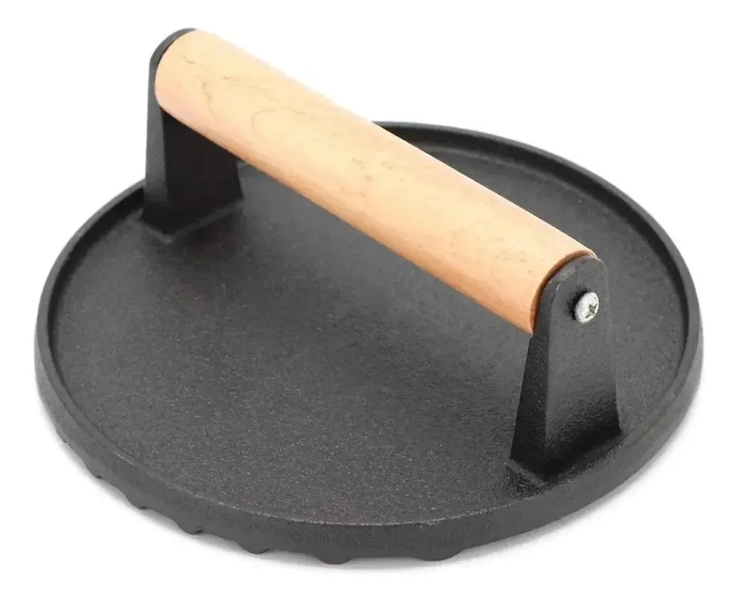 Lográ hamburguesas tipo smash con resultado profesional desde tu casa. Esta prensa redonda de hierro fundido es ideal para aplastar la carne de forma pareja, mejorando el sellado y potenciando el sabor. Su diseño permite una presión uniforme para conseguir bordes crocantes y un interior jugoso.