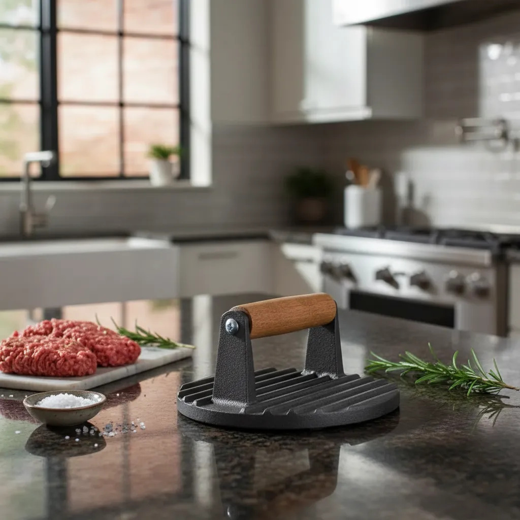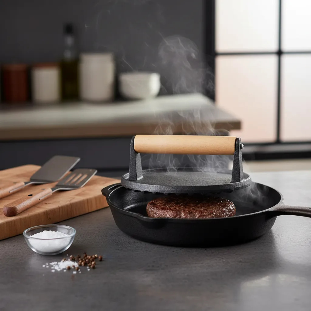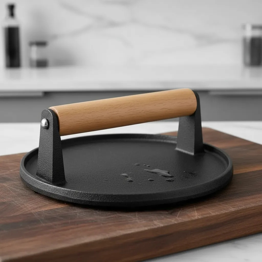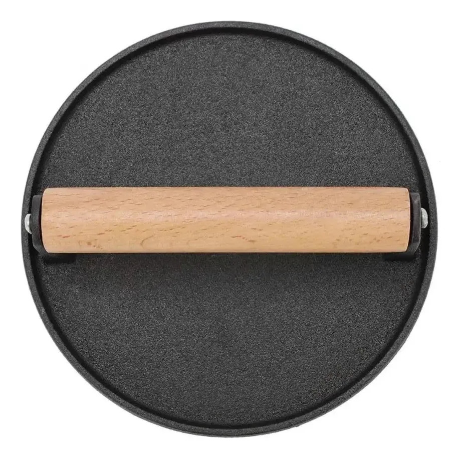 Lográ hamburguesas tipo smash con resultado profesional desde tu casa. Esta prensa redonda de hierro fundido es ideal para aplastar la carne de forma pareja, mejorando el sellado y potenciando el sabor. Su diseño permite una presión uniforme para conseguir bordes crocantes y un interior jugoso.