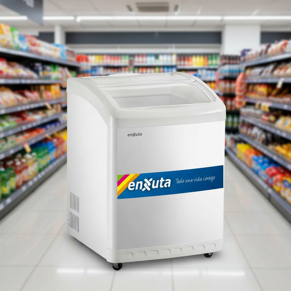 Equipo con función dual, freezer y refrigerador. Cuenta con una capacidad de 120 litros y puerta de vidrio corrediza con vidrio reflectivo al calor o de baja emisividad. El interior es de aluminio e incluye cerradura de seguridad y canasto metálico. Posee termostato ajustable, utiliza gas refrigerante R600a y cuenta con ruedas giratorias para facilitar su traslado. Incluye un año de garantía.
